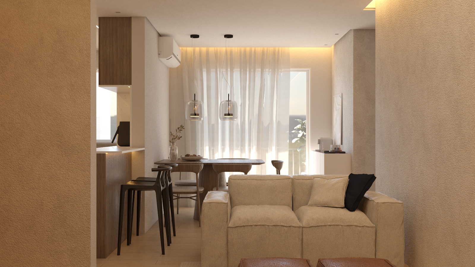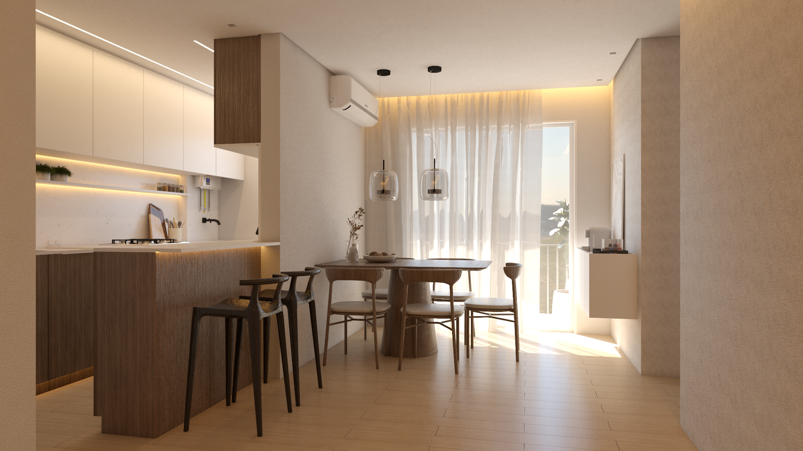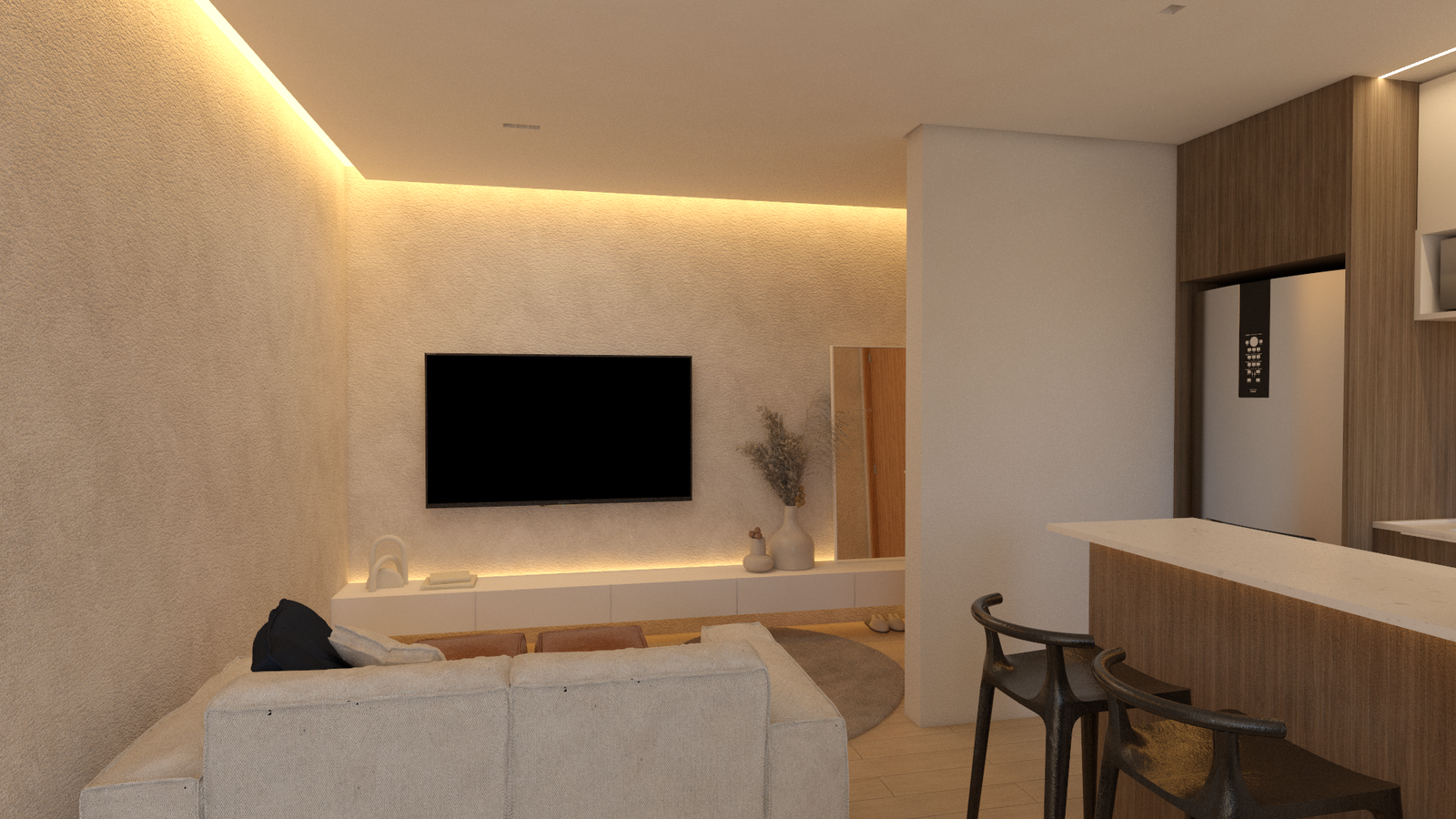 Neste apartamento, a proposta foi criar uma atmosfera leve, acolhedora e atemporal. Os tons claros predominam e ampliam os espaços, enquanto a madeira em tonalidade mais escura surge como elemento de contraste, trazendo profundidade, identidade e equilíbrio à composição.