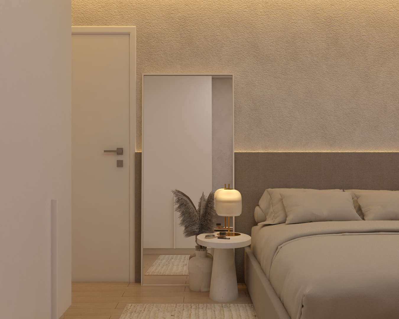 A integração entre os ambientes reforça a sensação de fluidez e continuidade, com materiais que se repetem de forma harmoniosa, criando unidade visual em todo o projeto. A iluminação indireta foi cuidadosamente pensada para valorizar texturas, destacar planos e proporcionar uma sensação constante de aconchego.