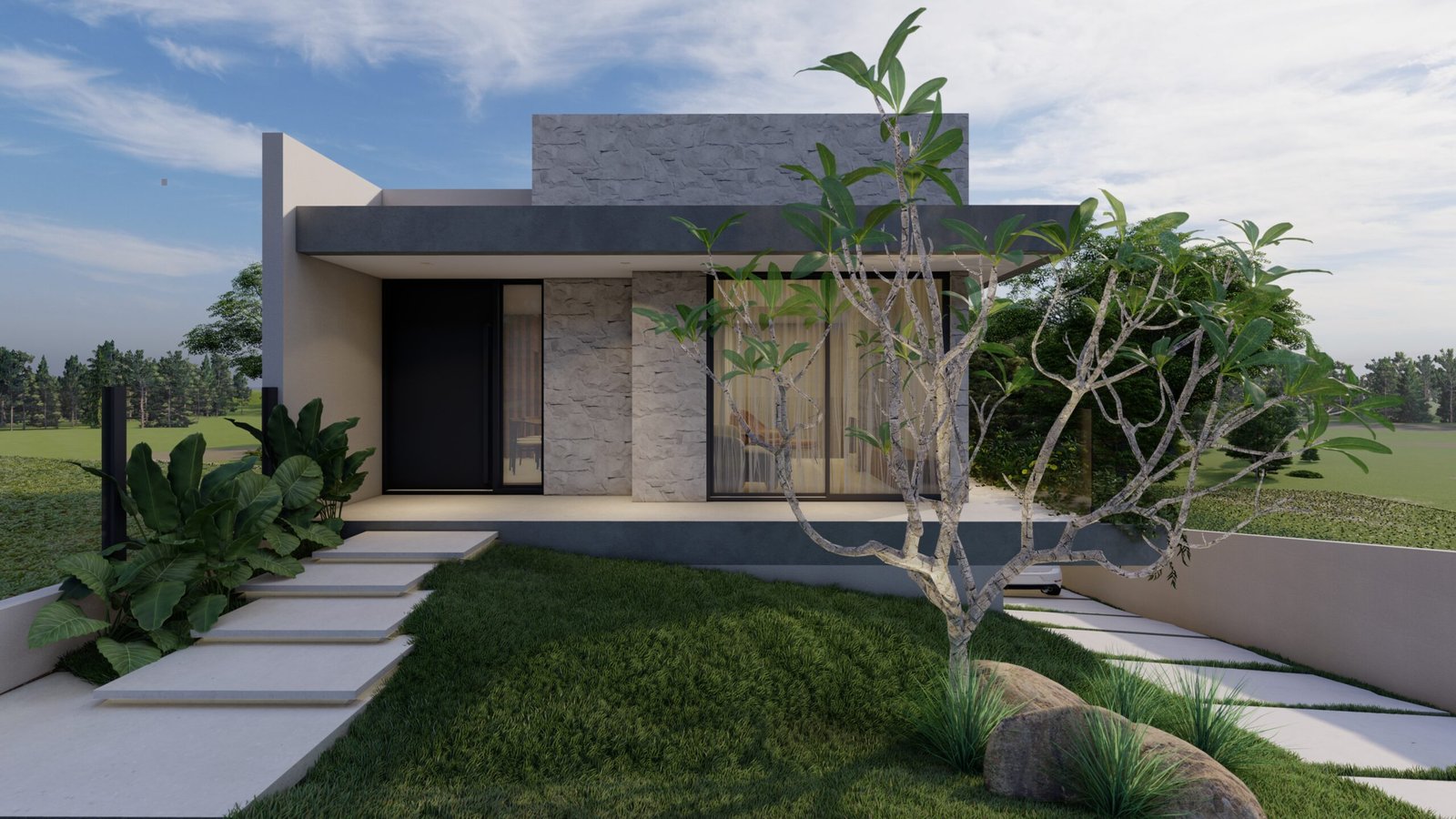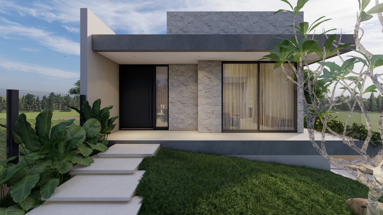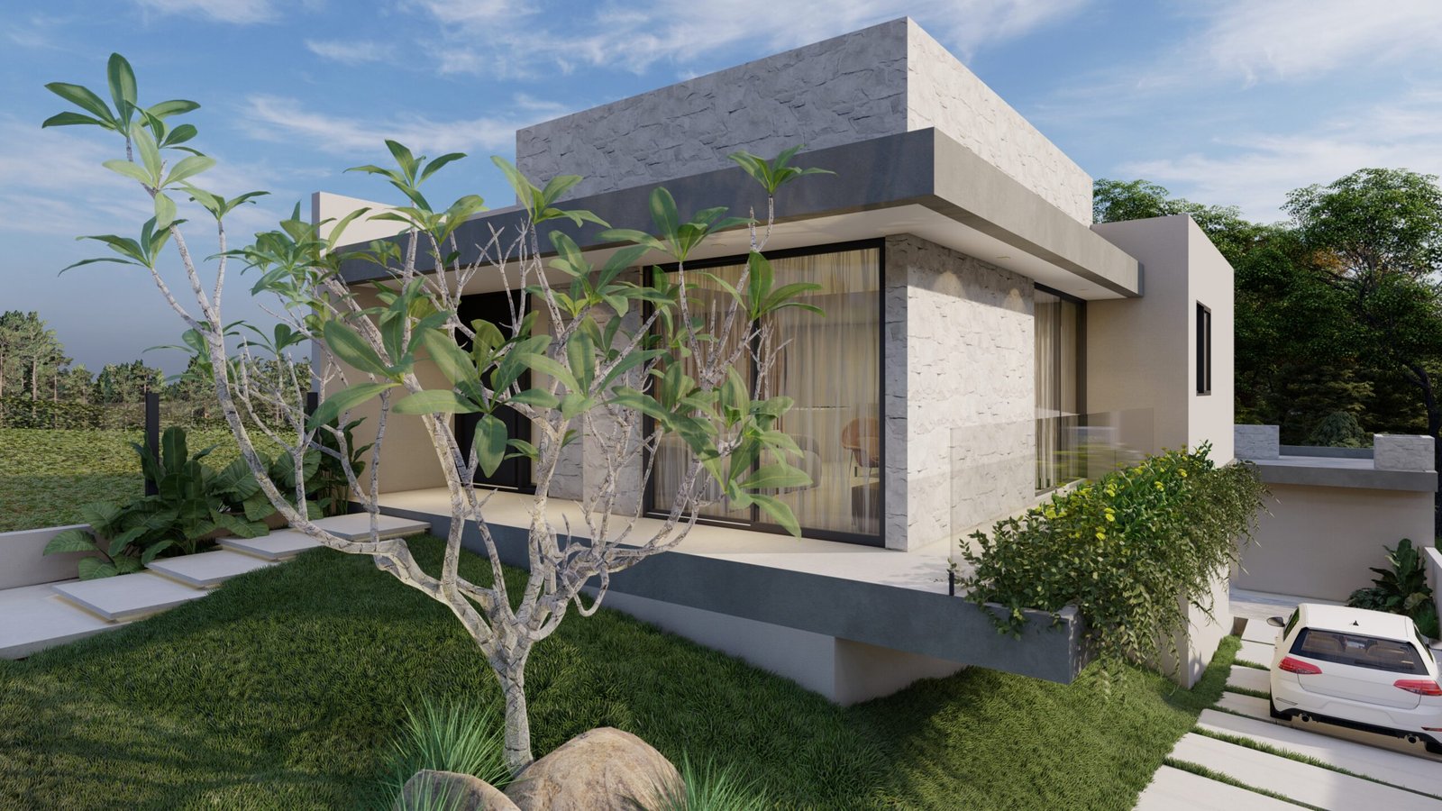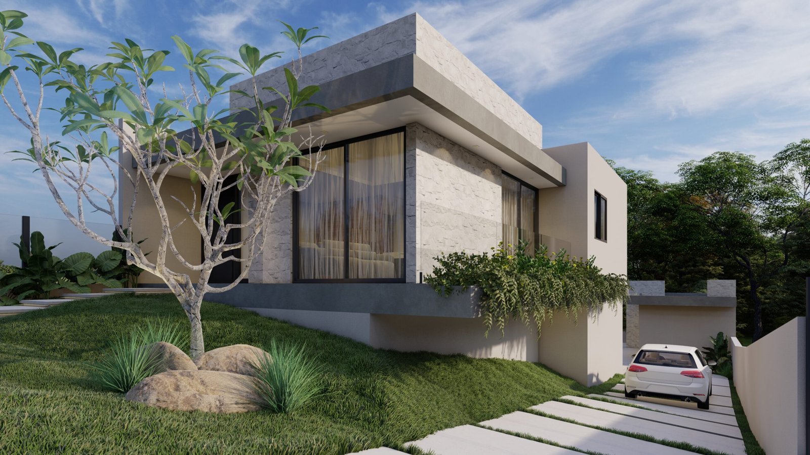 Projeto desenvolvido para um jovem casal, unindo estética, funcionalidade e conforto. A fachada se destaca pela composição de volumes e pelo contraste de texturas, que reforçam a horizontalidade e a linguagem contemporânea da residência.