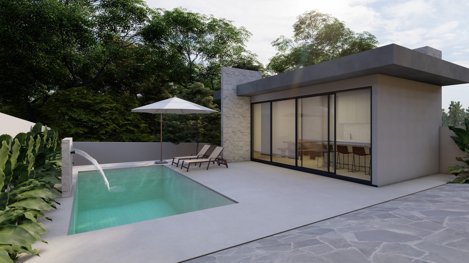 Implantada em um terreno com declive acentuado, a solução posiciona a casa na parte frontal do lote, reservando os fundos para a área de lazer com gourmet e piscina, integrada à vegetação e pensada para garantir privacidade e bem-estar.