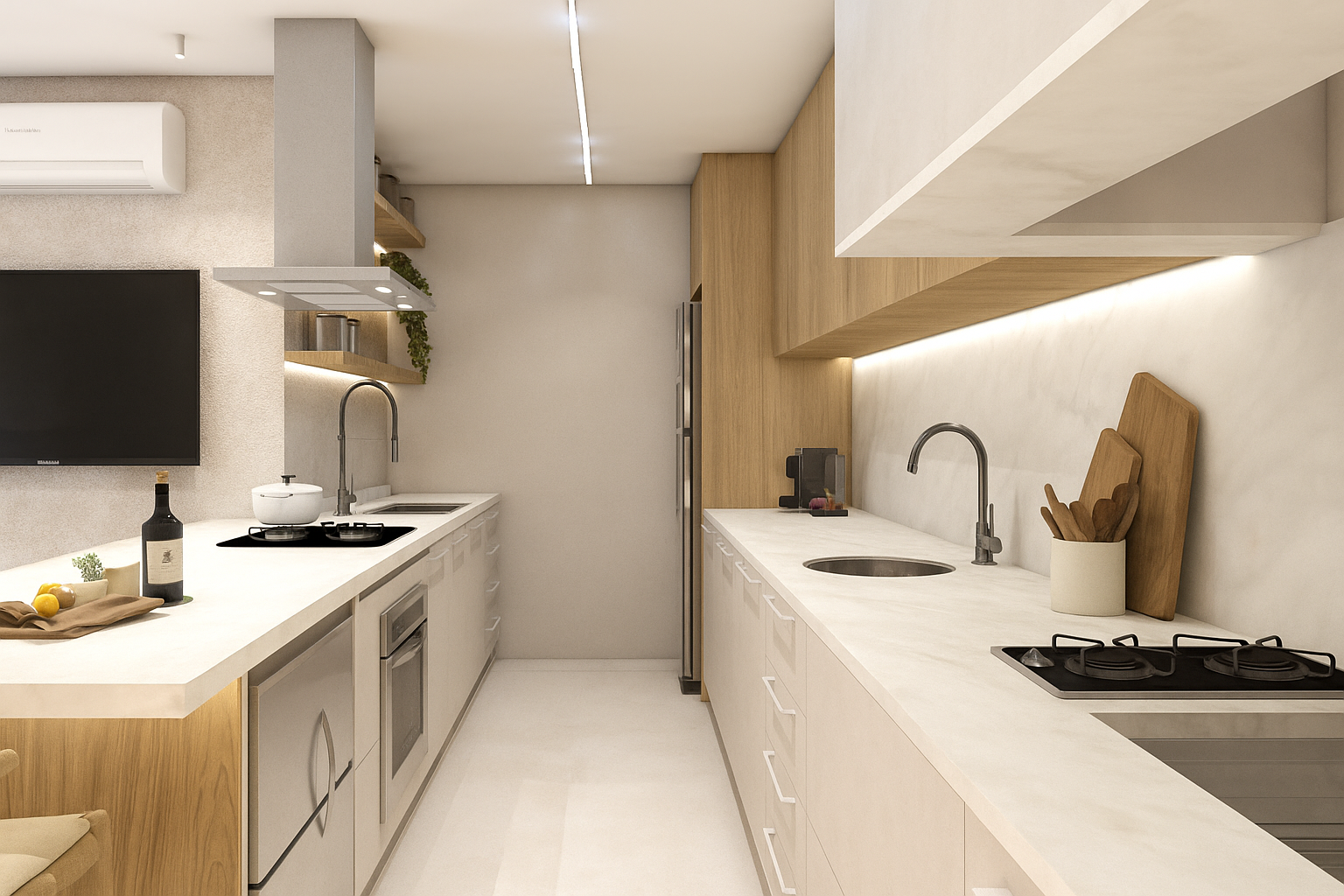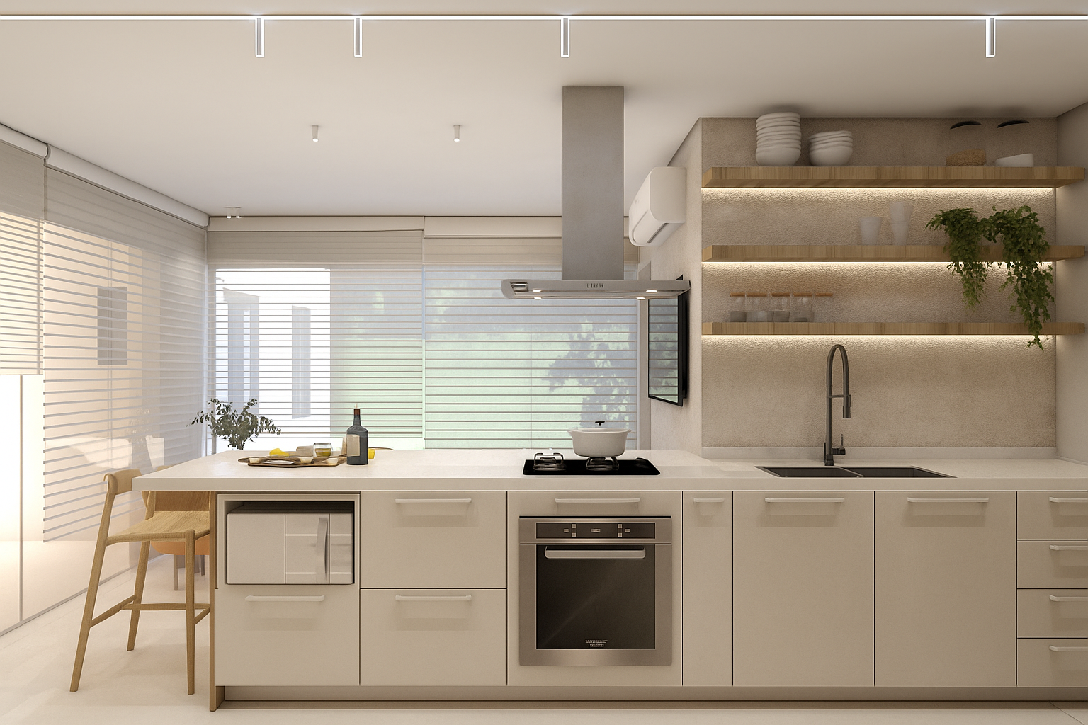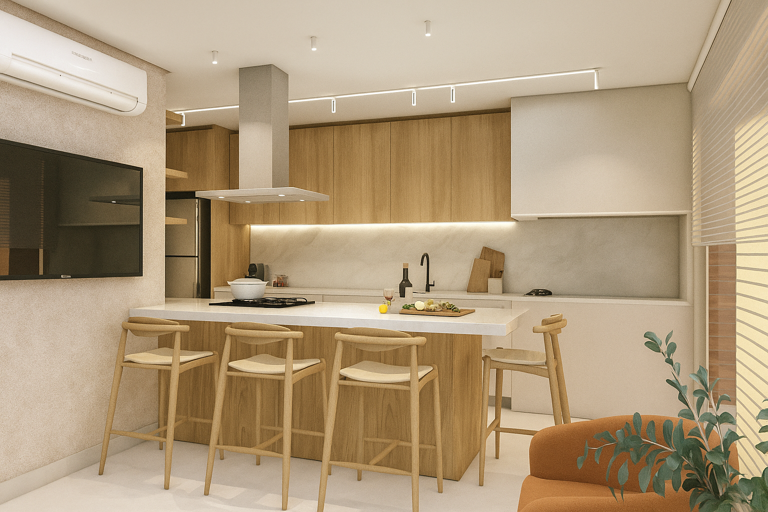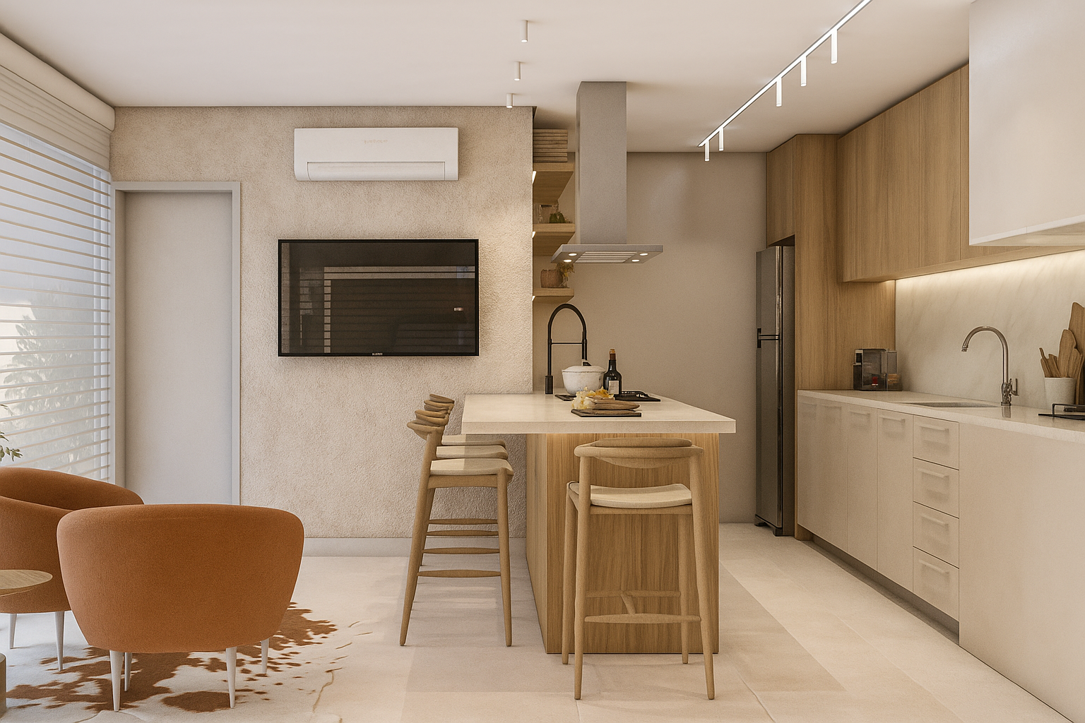 A proposta une praticidade e aconchego, com uma escolha cuidadosa de materiais. A combinação dos elementos traz leveza, elegância e personalidade ao espaço, criando a atmosfera ideal para os momentos de convívio.
